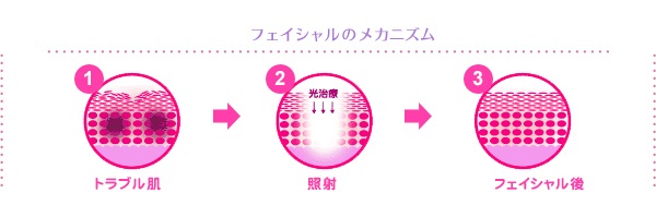 光がニキビの赤みや、ニキビ跡の色素沈着に反応し、目立たなくします。また、コラーゲン再生が活性化することで、ニキビ跡の凸凹を改善します。